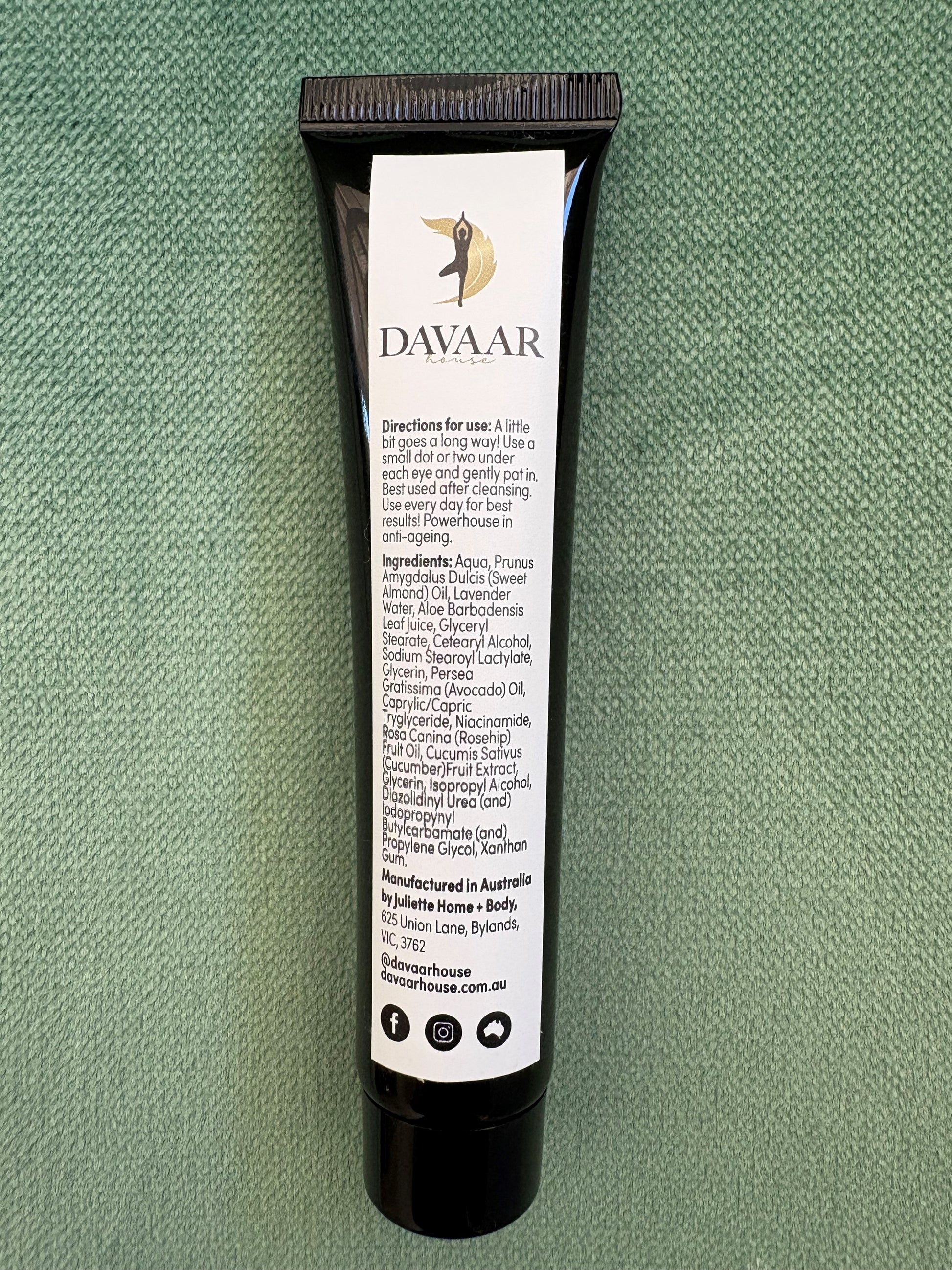 Davaar undereye Cream, helps to improve the appearance of fine lines and wrinkles. Hydrates the undereye and neck area. This is a glorious heavy weight eye cream, designed to go a long way, less is more with this product.